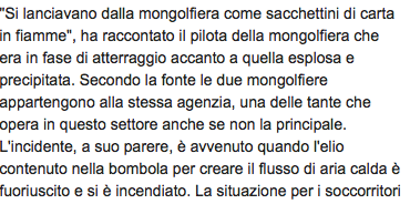Sì, scrivono proprio così. Repubblica lo scrive qui; l'ANSA lo riporta qui. Solo che l'elio non è infiammabile. Se lo fosse, i palloncini che si regalano ai bambini sarebbero delle bombe incendiarie. Ma questa riflessione evidentemente non è passata per la testa di chi ha scritto questa baggianata. E a nessuno dei giornalisti che l'ha scritta o copiaincollata è venuto il dubbio che questa dichiarazione (attribuita apparentemente al pilota) fosse una cretinata macroscopica.
