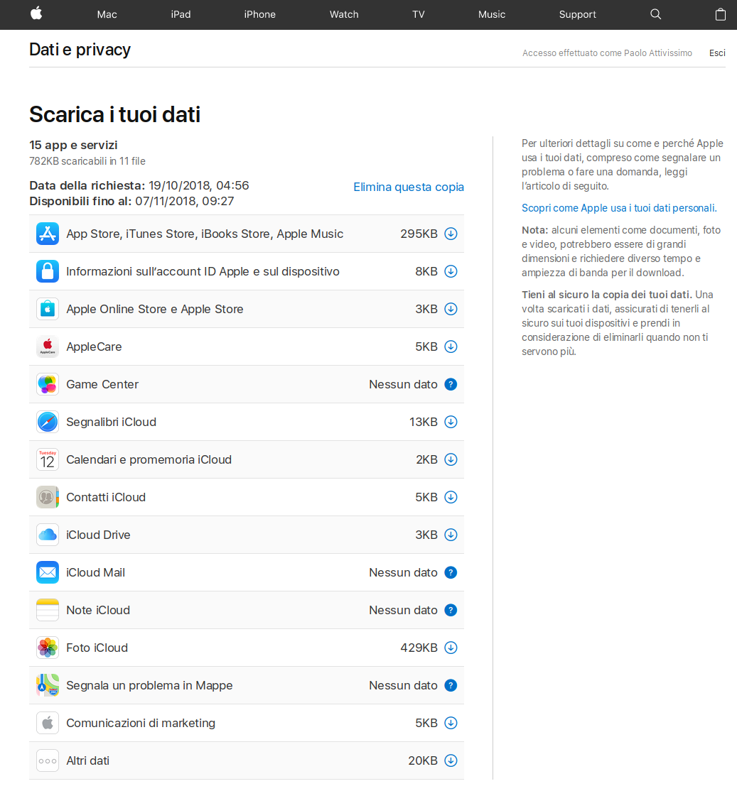 Di recente ho segnalato che ora è possibile chiedere ad Apple di ricevere una copia di tutti i propri dati andando presso Privacy.apple.com. Ho provato a farlo il 19 ottobre scorso, e quattro giorni dopo mi è arrivata una mail di Apple contenente un link per scaricare i miei dati.