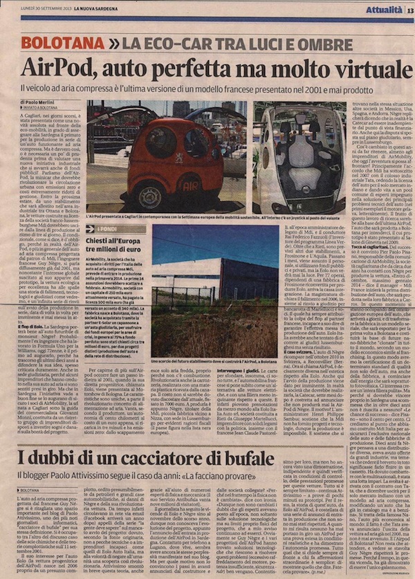 La Nuova Sardegna raccoglie le mie perplessità, basate su quelle dei tecnici, che sono le solite: la fisica indica che l'efficienza promessa avrebbe del prodigioso. Ma senza entrare in disquisizioni di fisica, c'è un fatto imbarazzante di fondo: a quanto mi risulta nessuno ha mai portato in giro una vettura ad aria compressa realizzata da Guy Negre per una prova estesa e indipendente, in condizioni realistiche, ed è riuscito a confermare l'autonomia e le prestazioni promesse. L'auto ad aria, per ora, è priva di qualunque riscontro.