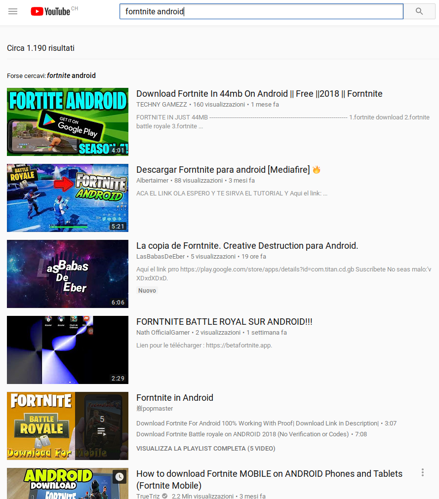 Youtube è appestata da video che annunciano trucchi per avere Fortnite per Android, dicono che l’app è nel Play Store (falso) o che c’è una versione non ufficiale o un’APK scaricabile andando a un sito che non è il Play Store e abilitando l’opzione per installare app da fonti sconosciute. Non credeteci.