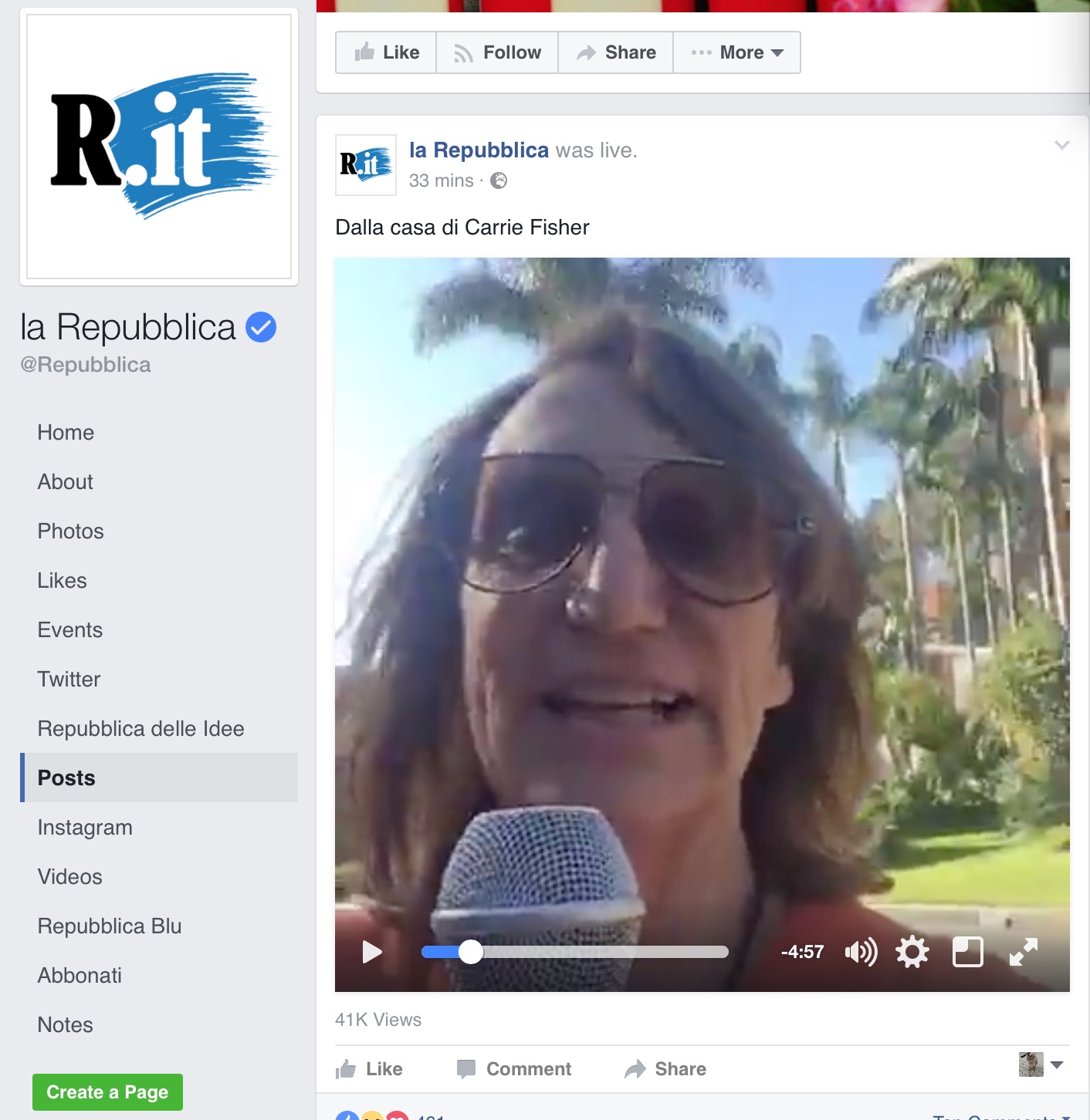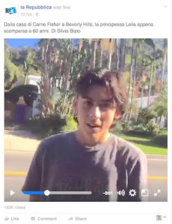 Il 27 dicembre è morta la popolarissima attrice e scrittrice Carrie Fisher. Repubblica ha pubblicato sulla propria pagina Facebook ufficiale un servizio giornalistico video di Silvia Bizio, nel quale la giornalista va davanti alla casa di Carrie Fisher, gira un video di cinque minuti in stile “selfie con telefonino” e nota con commiserazione che non ci sono nugoli di fan piangenti o altre manifestazioni di lutto. Cosa piuttosto difficile, visto che la casa sta su una trafficatissima strada principale senza marciapiedi, ma lasciamo stare. Lasciamo stare anche la qualità del servizio e i suoi sorrisetti, le sue frasi smozzicate, le sue risatine e le sue immagini traballanti. Pura aria fritta, ma pazienza.