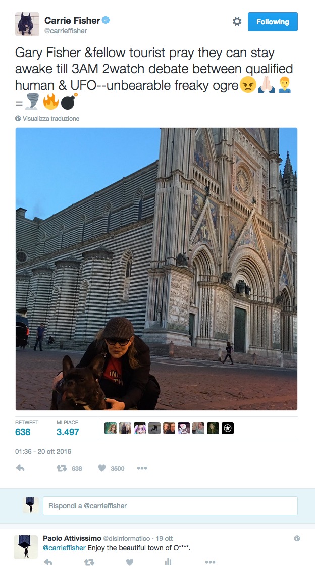 La signora accucciata con il proprio cane nella foto qui accanto non è una signora qualsiasi: è Carrie Fisher, nota a generazioni di appassionati come la Principessa Leia di Star Wars, in viaggio in Italia in incognito. L’altroieri era a Orvieto. Come faccio a saperlo? Nella foto che ha tweetato non ci sono informazioni di geolocalizzazione, ma l’edificio sullo sfondo è facilmente riconoscibile e localizzabile: è il Duomo di Orvieto. Per verificarlo basta immettere la foto in Google Immagini. Ovviamente per non mandarle un’orda di fan non ho scritto per esteso il nome della località nel mio tweet pubblico di saluto.