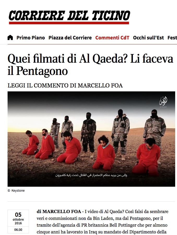Mi manca il tempo di rispondere immediatamente e in dettaglio alle segnalazioni che mi stanno arrivando a proposito di un articolo del Corriere del Ticino di oggi, a firma di Marcello Foa (copia su Archive.org), secondo il quale “certi filmati di Al Qaeda erano "made in USA"”.