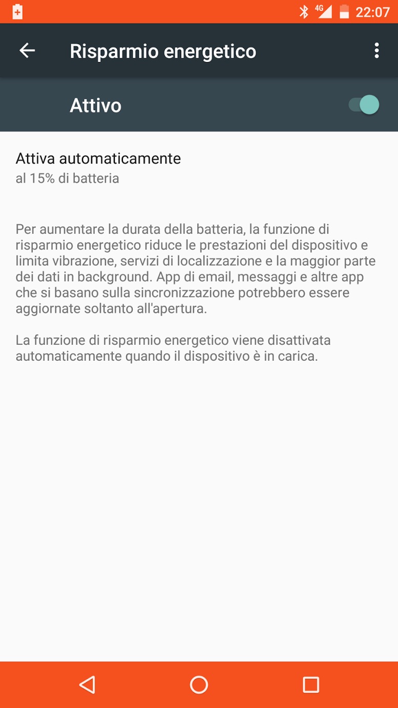 Se scegliete Attivo, la attivate subito: viene ridotta la vibrazione (se l’avete attivata), vengono limitati i servizi di geolocalizzazione (quindi Google Maps non funziona) e viene quasi eliminata la ricetrasmissione di dati in background: in altre parole, le app per mail e messaggi si aggiorneranno soltanto quando le aprite. In pratica riducete il vostro smartphone a un telefonino basic. Noterete che sullo schermo vengono mostrate due bande arancioni, per ricordarvi che siete in modalità di risparmio energetico. Per disattivarla vi basta accedere alla stessa voce di menu usata prima oppure mettere lo smartphone sotto carica: la modalità resta disattiva anche quando scollegate il telefonino dalla carica.