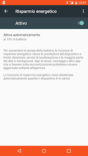 Potete anche impostare il risparmio energetico in modo che si attivi automaticamente quando la batteria scende al 5% o al 15%: questo è utile per evitare di trovarsi ad attivare il risparmio quando ormai la batteria è quasi completamente scarica. Se poi decidete che questa modalità non vi piace, impostate Mai, disabilitate Attivo e non la vedrete più se non la attivate manualmente.