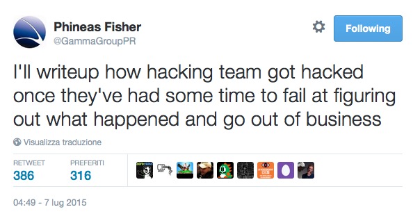 Il presunto autore dell'incursione si fa chiamare “Phineas Fisher” e ci sono alcune conferme indipendenti della validità della sua rivendicazione. Stanotte ha tweetato (immagine qui accanto) che scriverà come ha fatto a penetrare in HackingTeam “quando avranno avuto tempo di fallire nel capire cosa è successo e avranno cessato gli affari.” Cattivello, ma anche astuto nell'atteggiarsi a novello Robin Hood.