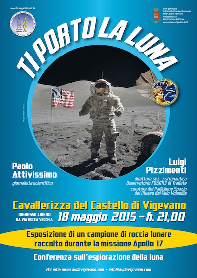 Se volete un selfie accanto a un pezzo di Luna portato sulla Terra dagli astronauti, venite stasera alle 21 a Vigevano, alla Cavallerizza del Castello: l'Associazione Vigevanese Divulgazione Astronomica vi ospita la conferenza-spettacolo Ti Porto la Luna, condotta da Luigi Pizzimenti e dal sottoscritto, che racconta la storia di un frammento di Luna e lo mostra dal vivo. Vi aspettiamo.