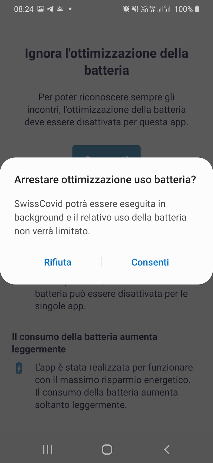Poi viene chiesto di ignorare l’ottimizzazione della batteria in modo da consentire all’app di essere sempre attiva, anche quando è in background. Questo fa aumentare il consumo della batteria “soltanto leggermente”.