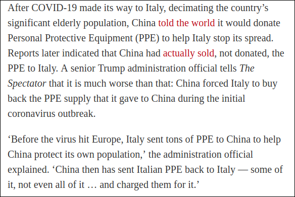 la fonte è "A senior Trump administration official" non identificato, che "tells The Spectator that it is much worse than that: China forced Italy to buy back the PPE supply that it gave to China during the initial coronavirus outbreak."— Paolo Attivissimo (@disinformatico) April 5, 2020