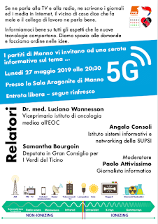 May 27, 2019 5:56In Rete circolano messaggi di preoccupazione e allarmismo per il 5G, la tecnologia cellulare di prossima introduzione, e in molti paesi, Svizzera compresa, c’è chi chiede moratorie e maggiore chiarezza sulle installazioni delle apposite antenne.Se volete conoscere i fatti per farvi un’opinione razionale, questa sera alle 20:30 a Manno (Canton Ticino), presso la Sala Aragonite, modererò un incontro pubblico informativo: per chi è su Facebook, i dettagli sono qui.