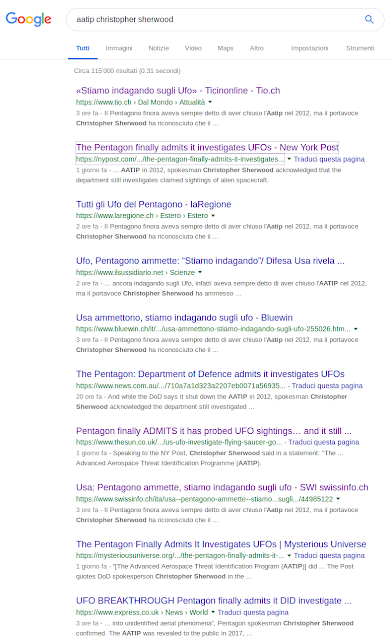Addirittura, un portavoce del Pentagono, Christopher Sherwood, avrebbe “riconosciuto che il dipartimento sta ancora indagando sui presunti avvistamenti di astronavi aliene.” (Tio.ch; Swissinfo.ch; ANSA; i link portano a copie permanenti su Archive.org).