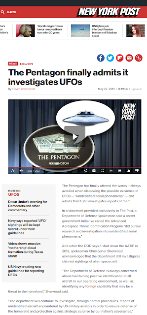 Leggendo sulla fonte originale (il NY Post) la dichiarazione del portavoce del Pentagono Christopher Sherwood, salta fuori che il portavoce non ha affatto parlato di “presunti avvistamenti di astronavi aliene”, come il NY Post vuole furbescamente suggerire con la sua grafica inequivocabile: