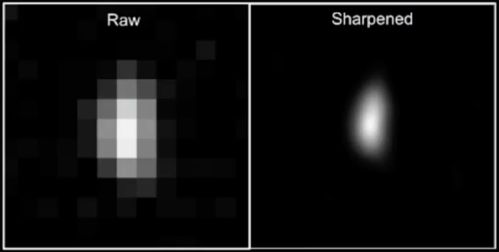 Finora questa è l’immagine più nitida ricevuta è questa, arrivata due giorni fa: a sinistra la versione grezza, a destra quella elaborata.