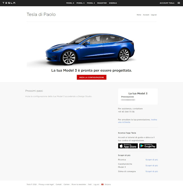 December 8, 2018 15:52Il 6 dicembre ho ricevuto una mail di invito (immagine qui accanto) a configurare la Model 3 che avevo pre-riservato ad aprile del 2016, quando quest’auto elettrica fu presentata al pubblico.L’auto è in vendita negli Stati Uniti da quasi un anno, ma è disponibile in Europa soltanto da pochi giorni.