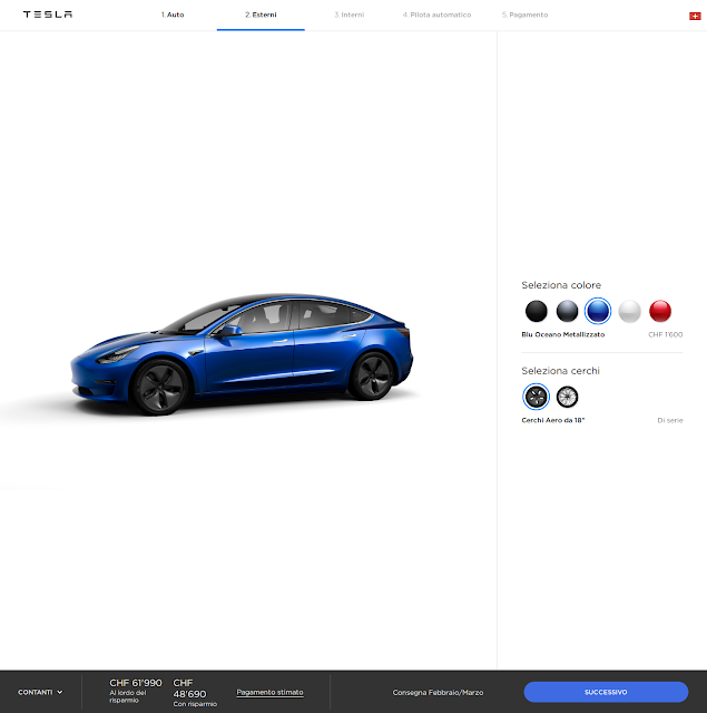 Scegliendo la meno costosa, mi viene proposto di scegliere il colore della carrozzeria (il nero è senza maggiorazione di prezzo, gli altri colori costano fino a 2600 CHF) e il tipo di cerchi (quelli Sport da 19" costano altri 1600 CHF; quelli Aero sono di serie).