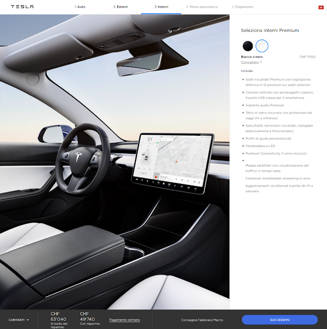 Il prezzo per contanti di una Model 3 blu con interni bianchi e neri e Autopilot sarebbe 68.340 CHF; in leasing mi verrebbe proposto un acconto di 6834 CHF, seguito da 60 mesi di rata da 623 CHF e da un importo finale (fra 5 anni) di 25.286 CHF. Questa è l’unica opzione di finanziamento disponibile online.