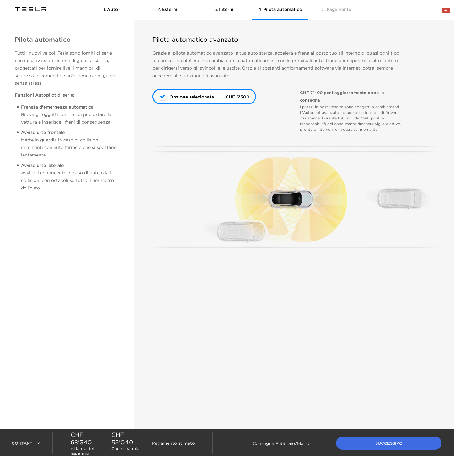 A questo punto posso scegliere se attivare subito il “Pilota automatico avanzato”: sono altri 5300 CHF. Se dovessi decidere di attivarlo successivamente, mi costerebbe 7400 CHF.