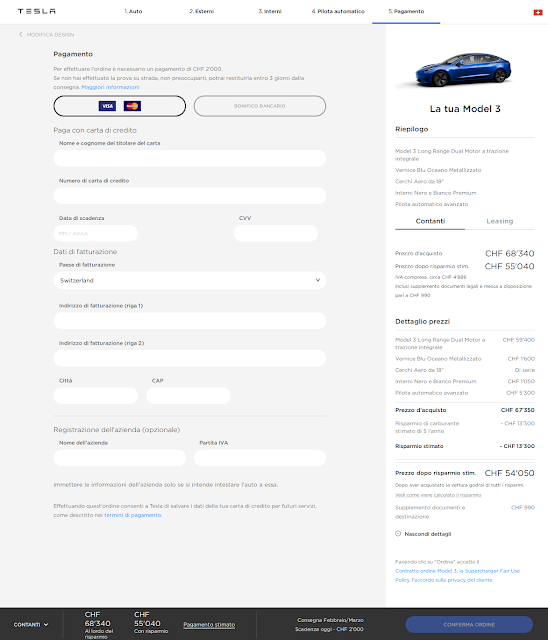 La tappa finale sarebbe la conferma definitiva dell’ordine: dovrei pagare subito 2000 CHF (oltre ai 1000 già anticipati, che posso soltanto presumere che verranno scalati dal prezzo totale, visto che nel configuratore non se ne parla). In questa schermata trovo i link al contratto d’ordine, alle norme di uso equo dei Supercharger e all’accordo sulla privacy.
