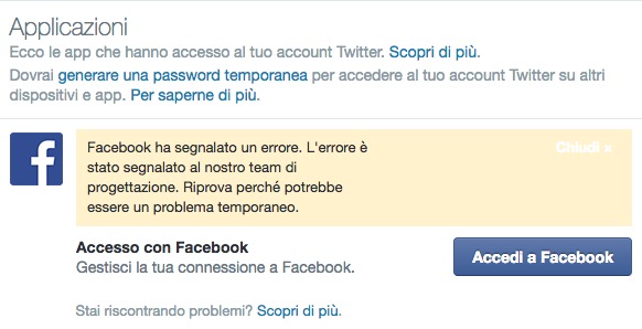 Erano mesi che Twitter mi diceva che c’era un “problema temporaneo” nel collegare il mio account Twitter al mio account Facebook (sì, ne ho uno, che dorme sonni tranquilli come segnaposto insieme alla pagina personale).