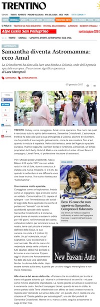 La notizia della nascita è stata data oggi inizialmente dal Trentino, che ha annunciato che il parto è avvenuto “alla fine di novembre” ma che l’astronauta “ha protetto il suo segreto gelosamente, come la sua creatura, fino a ieri, quando la notizia è trapelata”. L’articolo, a firma di Luca Marognoli, ha annunciato anche il nome, anzi i nomi, della bimba: “Kelsey, come coraggiosa. Amal, come speranza”.