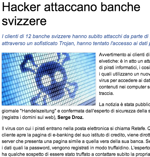 August 9, 2014 11:23 - no comments yetAllarmati per le notizie recenti di attacchi informatici alle banche svizzere? Tranquilli: il malware Retefe di cui si parla in queste notizie è una vecchia conoscenza dei servizi di sicurezza informatica e le banche si sono già premunite da mesi per contrastarla. Lo dice MELANI, la Centrale d'annuncio e d'analisi per la sicurezza dell'informazione, in risposta a questo articolo di Trend Micro, che parla di un'operazione denominata, con grande sforzo creativo, Emmental.L'attacco in realtà non prende di mira i siti delle banche, ma i dispositivi utilizzati dagli utenti per effettuare transazioni bancarie via Internet e in particolare la cosiddetta autenticazione a due fattori: in pratica il sito della banca, oltre a chiedere all'utente qualcosa che sa (la password), gli chiede anche qualcosa che ha (per esempio il telefonino, al quale viene inviato un ulteriore codice usa e getta di autenticazione). Se non vengono forniti entrambi i fattori di autenticazione, il sito della banca rifiuta l'accesso.