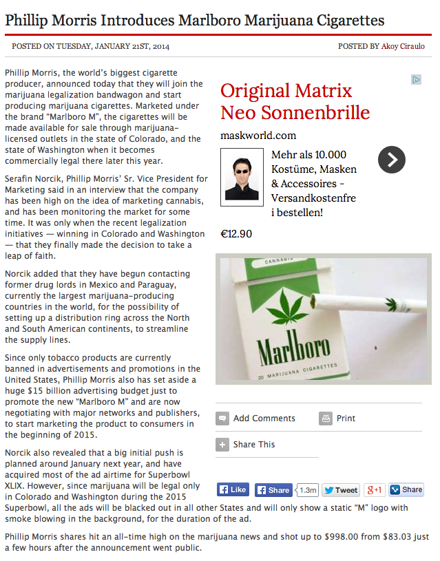 January 27, 2014 17:54 - no comments yetLa faccio molto, molto breve: la notizia che la Marlboro sta per introdurre le Marlboro M, dove M sta per marijuana, è una bufala diffusa dal sito di pseudonotizie Abril Uno. I dettagli sono su Snopes.com.Chi la ripubblica credendoci è un pollo, anche perché Abril Uno in spagnolo significa “primo aprile”. Per non parlare del fatto che se fosse vera, la notizia sarebbe probabilmente presente nei comunicati stampa della Philip Morris.