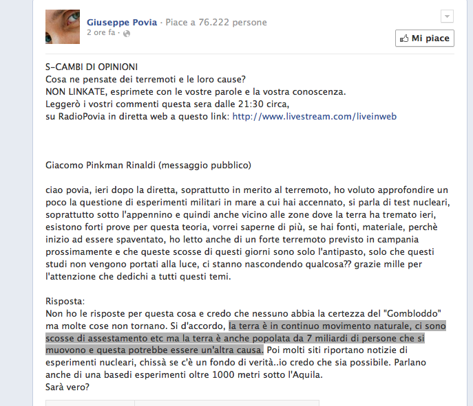 Giuseppe Povia, cantante sismologo, spiega l’origine dei terremoti