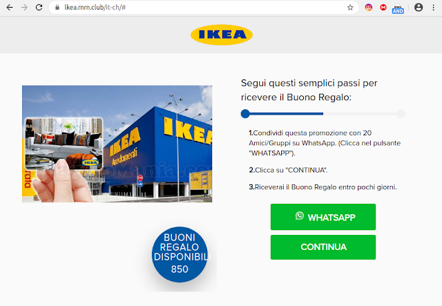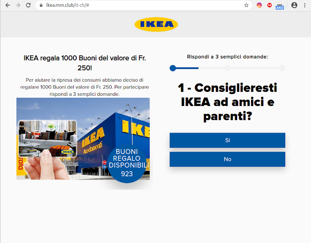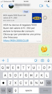 May 21, 2020 21:26Mi stanno arrivando moltissime segnalazioni di un’apparente offerta di “1000 buoni del valore di Fr. 250” che porta il marchio Ikea. È una truffa: non cliccate sul link e non inoltratelo a nessuno. Tio.ch ha già pubblicato un avviso in proposito.Ho provato ad approfondire simulando il comportamento di una vittima per vedere dove va a parare questo raggiro: ovviamente non si tratta di IKEA, anche perché il sito citato dal messaggio è lkea (L-K-E-A) punto S5S5 punto club.