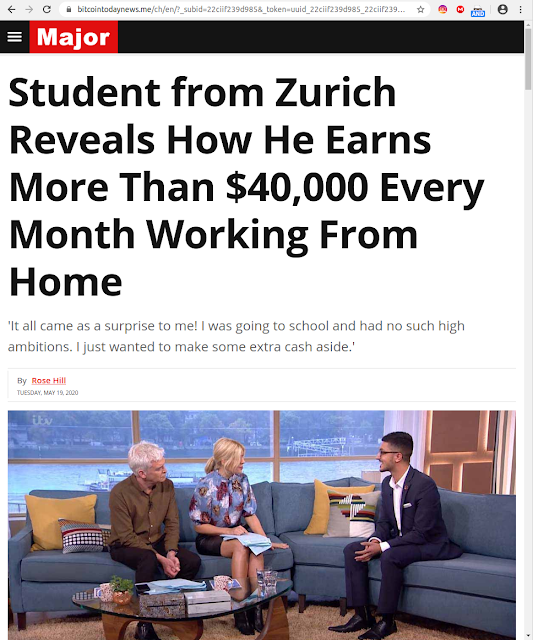 Cliccando poi su Continua si viene portati a un girotondo di redirect da un sito all’altro: ho fatto in tempo ad annotare un http://trackout punto business/?_lp=1. Nel mio caso sono finito qui: una finta pagina di notizie che promuove bitcoin rubando immagini della rete televisiva britannica ITV.