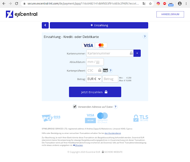 Zur Beachtung: Je nach Ihrer Bank könnte diese Transaktion als Bargeldauszahlung behandelt werden. Excentral EUR übernimmt keine Verantwortung für etwaige Bargeldauszahlungsgebühren in Zusammenhang mit dieser Transaktion. Die Transaktion wird auf Ihrer Kreditkartenabrechnung erscheinen als Excentral, falls auf Ihrer Transaktionsbestätigung nicht etwas anderes angegeben ist.