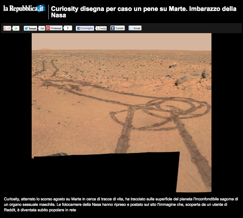 “Curiosity disegna per caso un pene su Marte. Imbarazzo della Nasa”, titola Repubblica. E spiega: “Curiosity, atterrato lo scorso agosto su Marte in cerca di tracce di vita, ha tracciato sulla superficie del pianeta l'inconfondibile sagoma di un organo sessuale maschile.” La pagina di Repubblica, fra l'altro, è stracolma di pubblicità che qui vi risparmio.