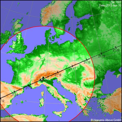 April 9, 2013 21:00 - no comments yetLa Stazione darà spettacolo stasera, nuvole permettendo: non occorrono binocoli o altro, perché è visibile a occhio nudo come punto bianco molto luminoso che procede nel cielo senza lampeggiare e poi si affievolisce quando entra nel cono d'ombra della Terra. Nell'immagine qui sopra, la linea indica la proiezione della sua traiettoria sulla superficie terrestre. Chi si trova su questa linea vedrà la Stazione sopra la propria testa, allo zenit; chi si trova all'interno del cerchio rosso la vedrà lo stesso, ma più bassa sull'orizzonte man mano che aumenta la distanza dalla linea nera. I dettagli sono su Heavens-Above.com. Buona visione.