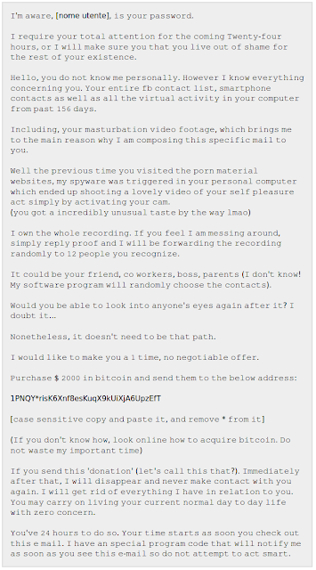 April 24, 2020 7:09Hanno ricominciato a circolare le mail provenienti da ricattatori che dicono di conoscere una password della vittima e chiedono soldi per non rivelare le sue attività intime, che sarebbero state riprese attraverso la webcam.Cose tipo questa (notate il font/carattere nonstandard, usato probabilmente per sfuggire ai filtri antispam):
