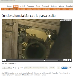 March 12, 2013 21:00 - no comments yetCorriere: “Alle 19.06 fumata bianca dal comignolo sulla Cappella Sistina, e dai fedeli radunati in Piazza San Pietro si è levato un boato di gioia, mentre le campane della basilica hanno cominciato a fumare.”