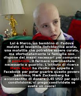 Riporto qui il testo integrale dell'appello per renderlo facilmente ritrovabile con i motori di ricerca: “Lui è Marco, un bambino di Padova malato di leucemia linfoblastica acuta, una malattia che potrebbe essere curata, ma sfortunatamente la famiglia non dispone dei mezzi necessari per comprare il ponatinib, il farmaco sperimentale necessario a guarirlo. L'istituto di ricerca Mario Negri ha rivolto un appello a Facebook per poter guarire questo povero bambino, Mark Zuckenberg ha acconsentito di donare 0,45 USD per ogni condivisione, vi prego condividete se avete un cuore!”