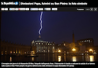 Sta spopolando la foto di un fulmine che colpisce San Pietro, presentata per esempio qui su Repubblica e attribuita al fotografo ANSA Alessandro Di Meo. Secondo la didascalia, lo scatto è stato realizzato proprio nella giornata dell'annuncio delle dimissioni del Papa, e quindi ha un valore simbolico davvero notevole.