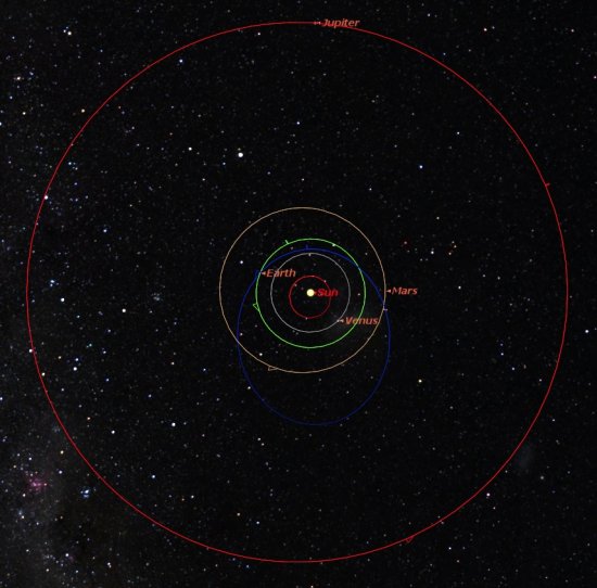 La NASA ha pubblicato la ricostruzione, basata sui dati finora disponibili, dell'orbita che la meteora russa seguiva prima di incontrare la Terra venerdì scorso. Nell'immagine qui sotto, tratta appunto dalla ricostruzione, l'orbita della meteora è quella tracciata in blu.