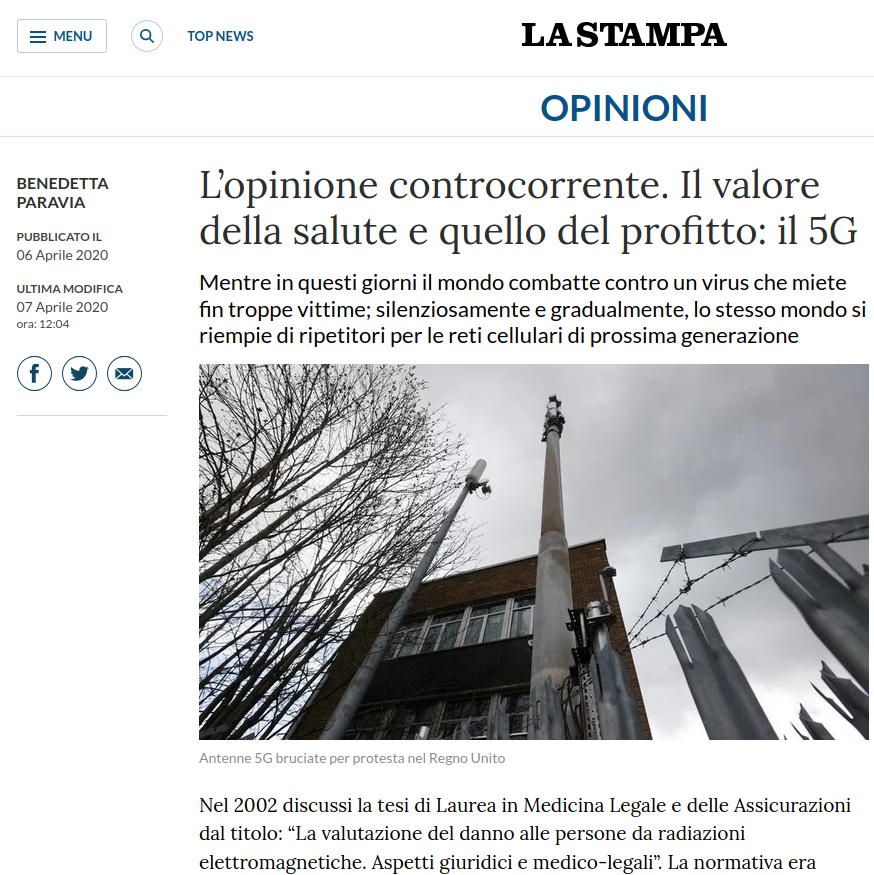 April 11, 2020 5:13Ultimo aggiornamento: 2020/04/11 10:10.Sono arrivate moltissime segnalazioni di un articolo a firma di Benedetta Paravia su La Stampa che pubblica falsità, deliri e assurdità a proposito della telefonia 5G.
