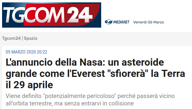 TGCom24 ha pubblicato ieri un tweet che dice testualmente “Un asteroide grande come l'Everest sfiorerà la Terra il 29 aprile”. Il tweet è accompagnato da un’illustrazione che mostra un asteroide incandescente puntato dritto verso il centro dell’Africa.