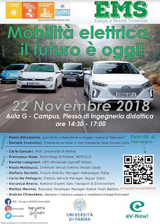 November 22, 2018 5:35Come ho preannunciato alcuni giorni fa, oggi sarò alla Facoltà di Ingegneria dell’Università di Parma come co-moderatore del convegno Mobilità elettrica, il futuro è oggi!, organizzato dall’associazione studentesca universitaria EMS (Energia e mobilità sostenibile), dall’associazione per la mobilità elettrica eV-Now! Italia e dall’Università di Parma.Il convegno inizierà alle 14:30. Posso annunciare con piacere che ci sarà la diretta streaming su Youtube.