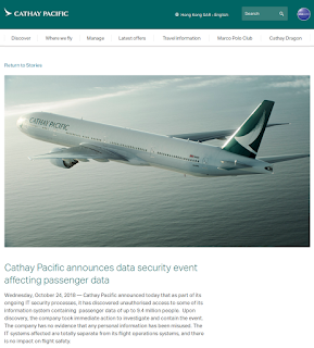 October 25, 2018 21:19Dopo la mail errata del sondaggio Sheraton, ecco un altro esempio di scarsa custodia dei nostri dati personali e di ancora più scarsa diligenza nel segnalarne il furto. La compagnia aerea Cathay Pacific ha annunciato due giorni fa che si è fatta rubare i dati di circa 9,4 milioni di passeggeri.O meglio, per dirla nel modo obliquo in cui l‘ha detta l’azienda, ha annunciato “un evento di sicurezza dei dati che ha effetto sui dati dei clienti”. Ci vuole un po’ di attenzione per capire che vuol dire “ci siamo fatti fregare”.