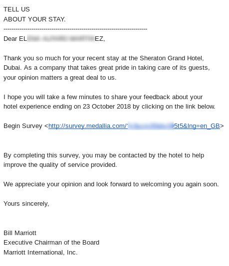 October 25, 2018 21:47Come custodiscono i nostri dati le aziende alle quali li affidiamo? Maluccio. Vorrei raccontarvi un esempio vissuto personalmente. Mia moglie ha ricevuto ieri una mail di ringraziamento per la sua recente visita allo Sheraton Grand Hotel di Dubai.La mail è “firmata” da “Bill Marriott, Executive Chairman of the Board, Marriott International, Inc.”. No, non è un tentativo di phishing. È un sondaggio, gestito da Medallia.com. Gestito maldestramente, direi. Perché mia moglie non è mai stata a Dubai, men che meno allo Sheraton di Dubai.