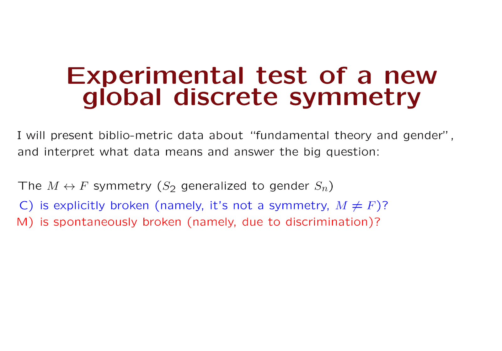 Lasciando a fatica da parte l’inglese pessimo e lo stile patetico della presentazione, commento solo quell’arrogante “la fisica l’hanno inventata e costruita gli uomini”: considerato che alle donne è stato impedito per secoli di studiare e di poter partecipare all’invenzione della fisica, proclamre una frase del genere è come organizzare un campionato di calcio dove puoi gareggiare solo la tua squadra e poi bullarti che hai vinto. Formalmente è vero, ma è la vittoria di un imbecille.