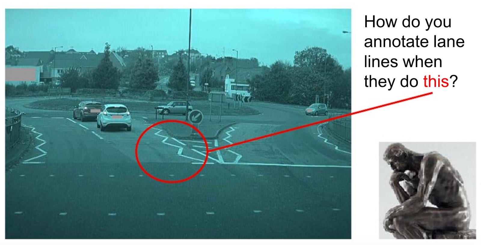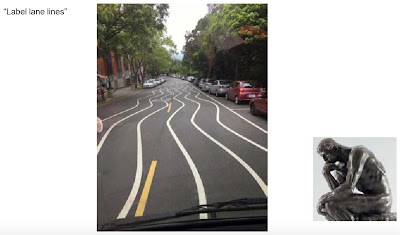 Ci sono anche altri esempi chiarissimi nella presentazione di Andrej Karpathy. Pare abbastanza banale riconoscere le righe di delimitazione di una corsia, ma poi trovi cose come queste: