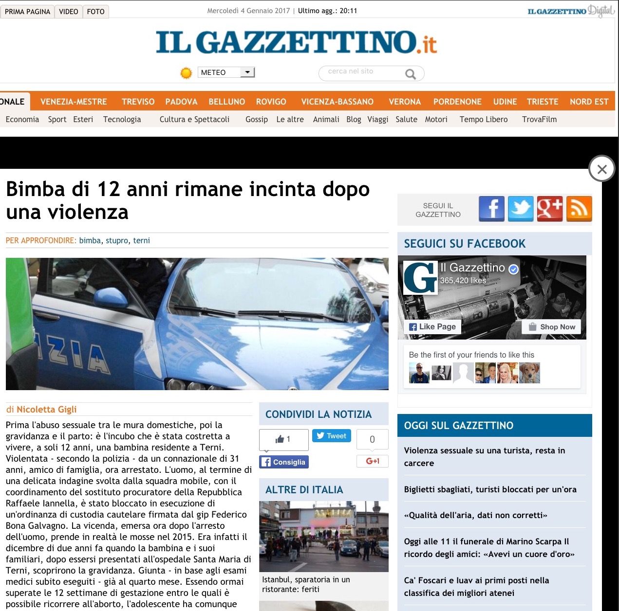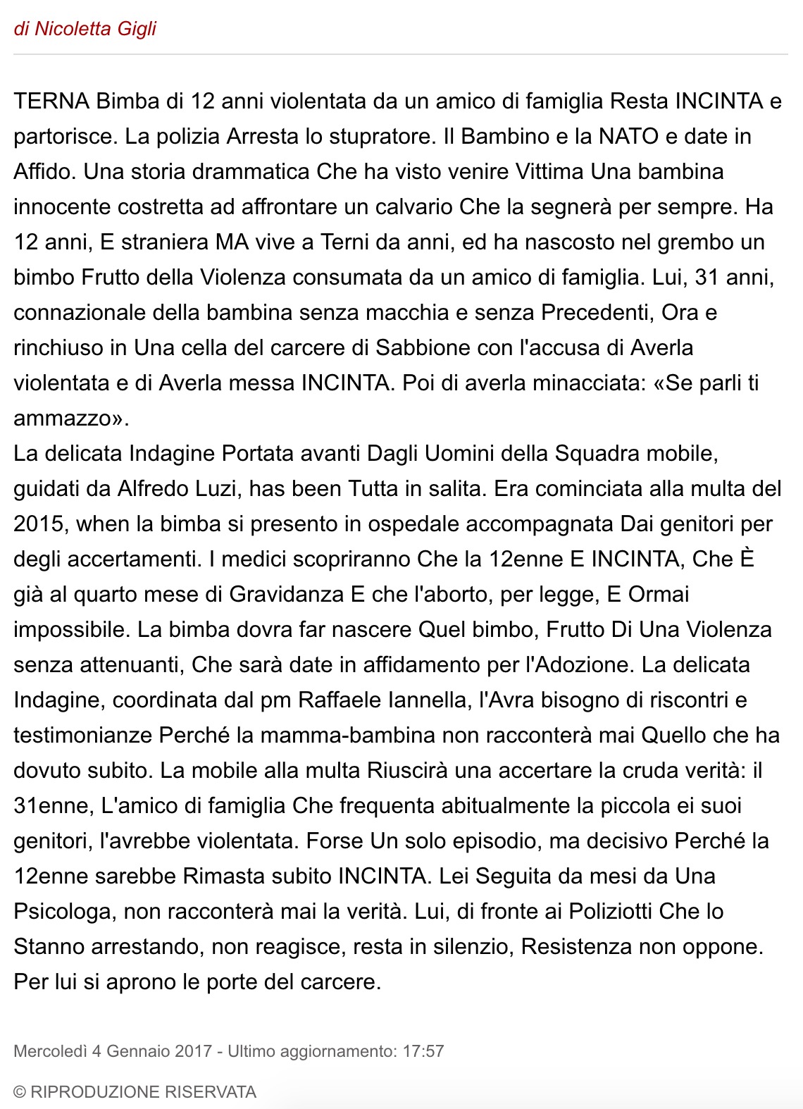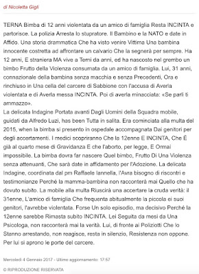 TERNA Bimba di 12 anni violentata da un amico di famiglia Resta INCINTA e partorisce. La polizia Arresta lo stupratore. Il Bambino e la NATO e date in Affido. Una storia drammatica Che ha visto venire Vittima Una bambina innocente costretta ad affrontare un calvario Che la segnerà per sempre. Ha 12 anni, E straniera MA vive a Terni da anni, ed ha nascosto nel grembo un bimbo Frutto della Violenza consumata da un amico di famiglia. Lui, 31 anni, connazionale della bambina senza macchia e senza Precedenti, Ora e rinchiuso in Una cella del carcere di Sabbione con l'accusa di Averla violentata e di Averla messa INCINTA. Poi di averla minacciata: «Se parli ti ammazzo».