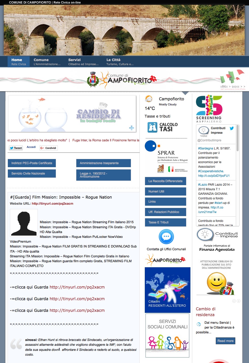 Il Comune di Campofiorito ospita addirittura le istruzioni per scaricare l'ultimo film della serie Mission: Impossible, come potete vedere qui accanto (presso http://www.comune.campofiorito.pa.it/index.php?option=com_k2&view=itemlist&task=user&id=5819). Complimenti.