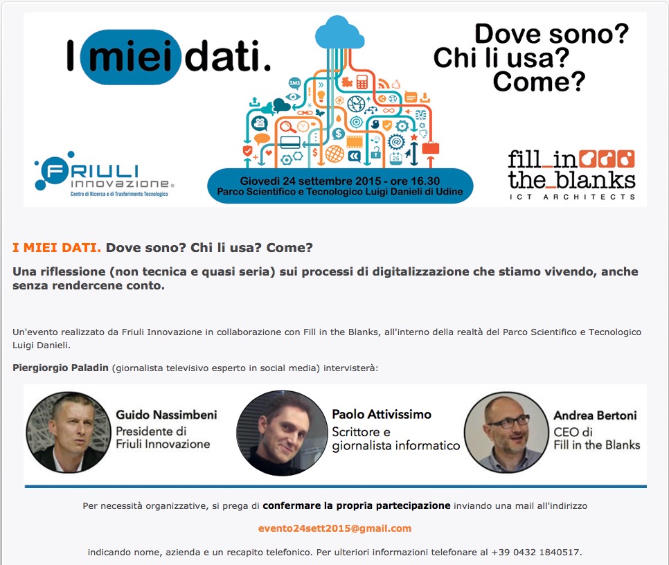 September 24, 2015 4:03Oggi alle 16:30 sarò ospite di Fill in the Blanks e di Friuli Innovazione a Udine, presso il Parco Scientifico e Tecnologico L. Danieli (via Linussio 51), per una “riflessione (non tecnica e quasi seria) sui processi di digitalizzazione che stiamo vivendo, anche senza rendercene conto” insieme a Guido Nassimbeni (Friuli Innovazione) e Andrea Bertoni (CEO di Fill in the Blanks).Se volete esserci, confermate la vostra partecipazione inviando una mail a evento24sett2015@gmail.com indicando nome, azienda e un recapito telefonico. Per ulteriori informazioni telefonate al +39 0432 1840517.