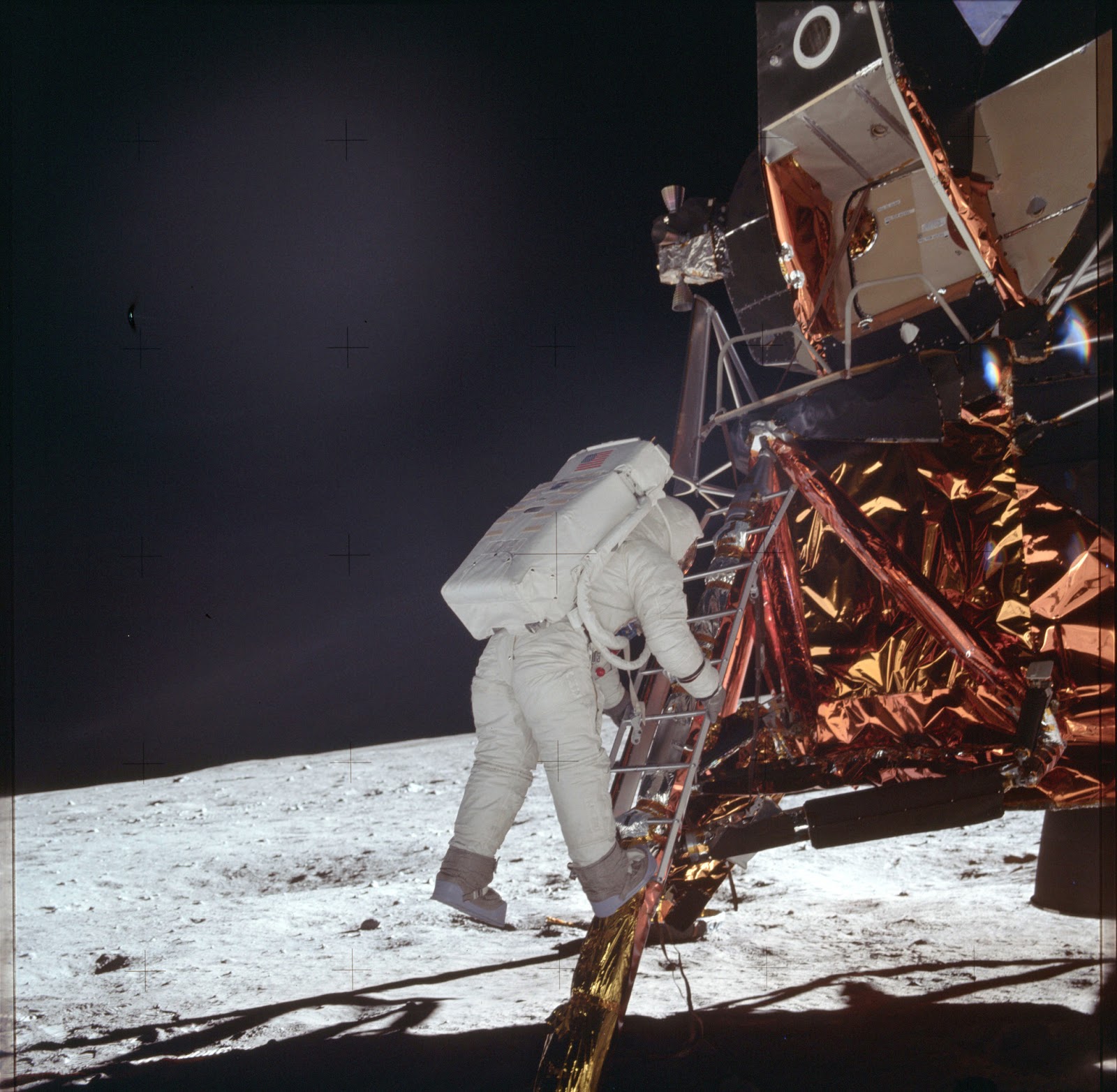 In particolare, questa tesi viene riferita alla foto qui sotto, che mostra Buzz Aldrin, secondo uomo a mettere piede sulla Luna, mentre scende lungo la scaletta e viene immortalato da Neil Armstrong, che è già sulla superficie lunare. Aldrin è nel cono d'ombra del veicolo spaziale (il Sole è a destra), eppure lo si vede benissimo. Come è possibile, senza una fonte di luce aggiuntiva che lo illumini e che sulla Luna non c'era?