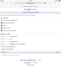 Ciascun membro della Famiglia del Maniero Digitale ha la propria agenda su Google Calendar e la condivide (in sola lettura o in lettura/scrittura) con gli altri. Ma Calendario (l'app di iOS) non vedeva i calendari condivisi. Vedeva subito i miei (ne ho più di uno, oltre a quello pubblico), ma non quelli degli altri. L'interfaccia dell'iPad non mi dava alcuna indicazione di come risolvere il problema. Andare in Calendario - Calendari - Modifica non mi portava a nulla di utile.