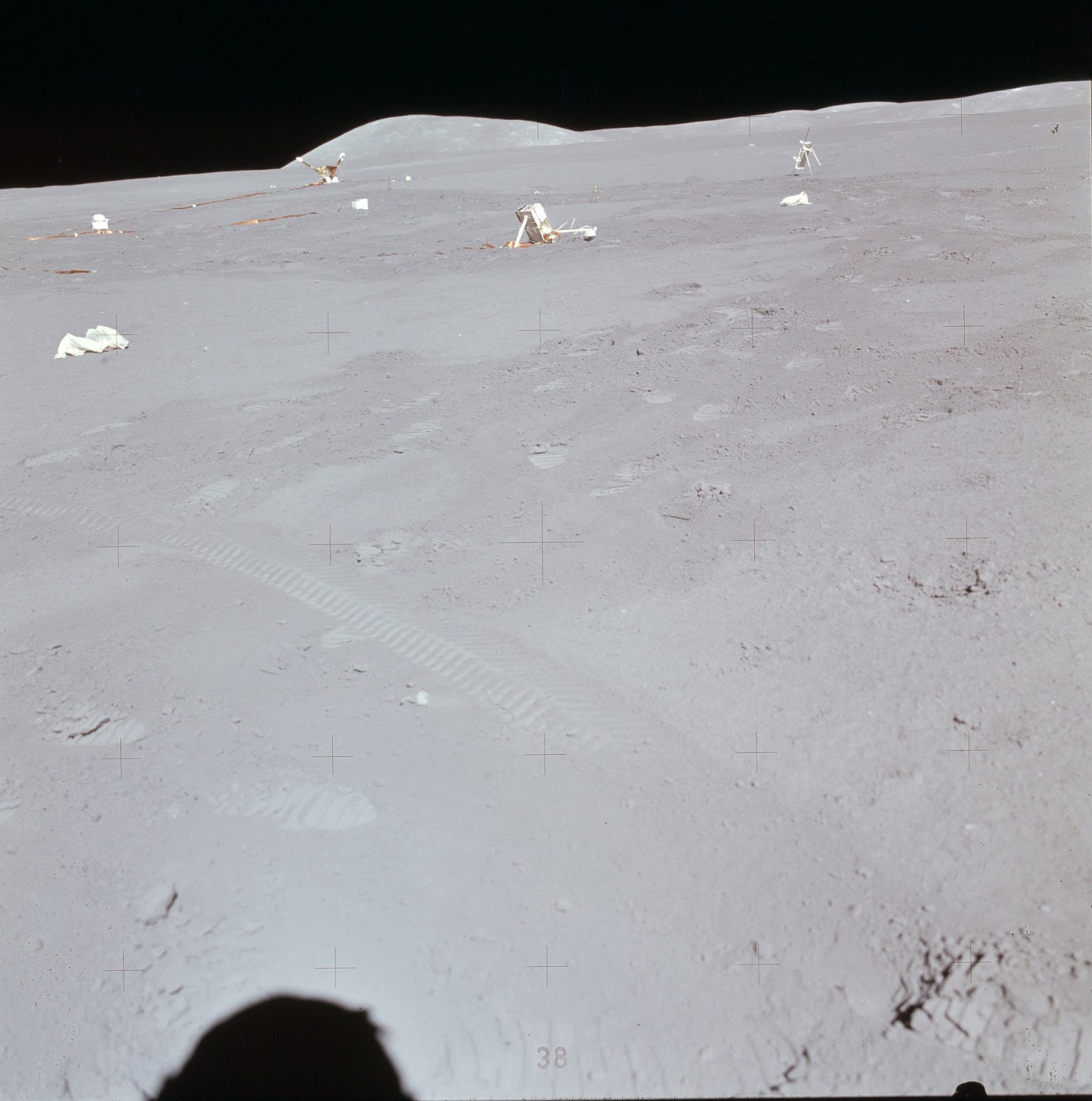 Tra le foto scattate sulla Luna dalla missione Apollo 15 ne ho trovate alcune che mostrano almeno due delle tre fotocamere usate all'esterno dagli astronauti: